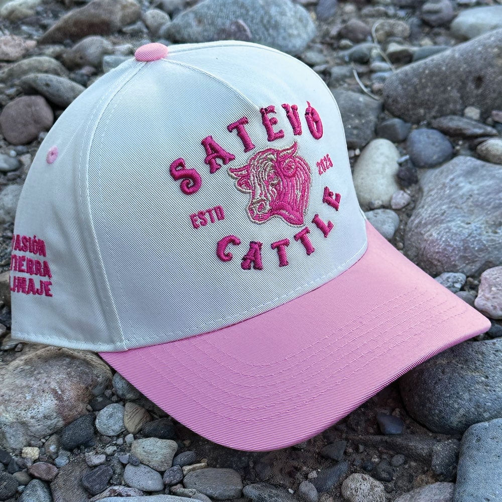 La gorra Satevó Cattle Co. mantiene viva la esencia del rancho y la herencia ganadera. Esta versión en rosa con beigecombina carácter y estilo, demostrando que la tradición también evoluciona sin perder sus raíces.